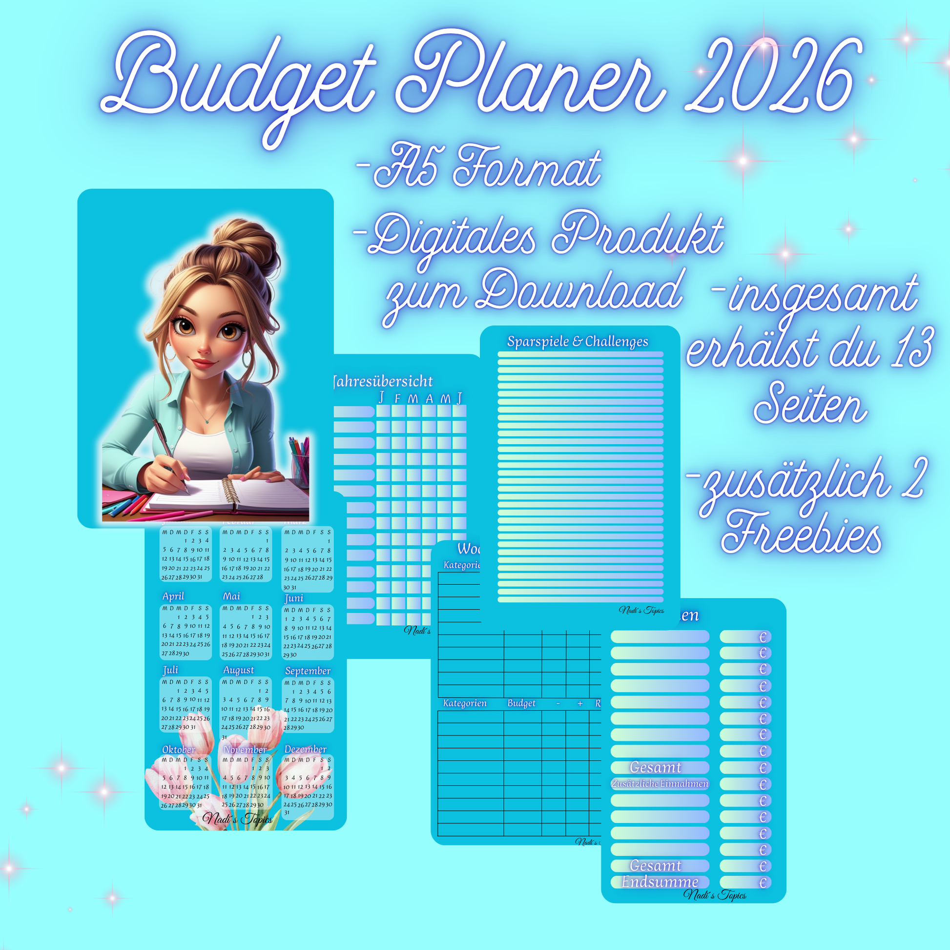 Dieser liebevoll gestaltete Budgetplaner hilft Ihnen, Ihre Finanzen übersichtlich zu planen – inklusive Jahresüberblick, Monatsüberblick, Einnahmen-, Ausgaben-, Wochenübersicht, Sparspiele, Notizen & Freebies.🥰